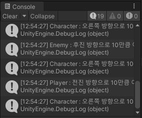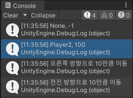 Debug.Log("오른쪽 방향으로 10만큼 이동");
