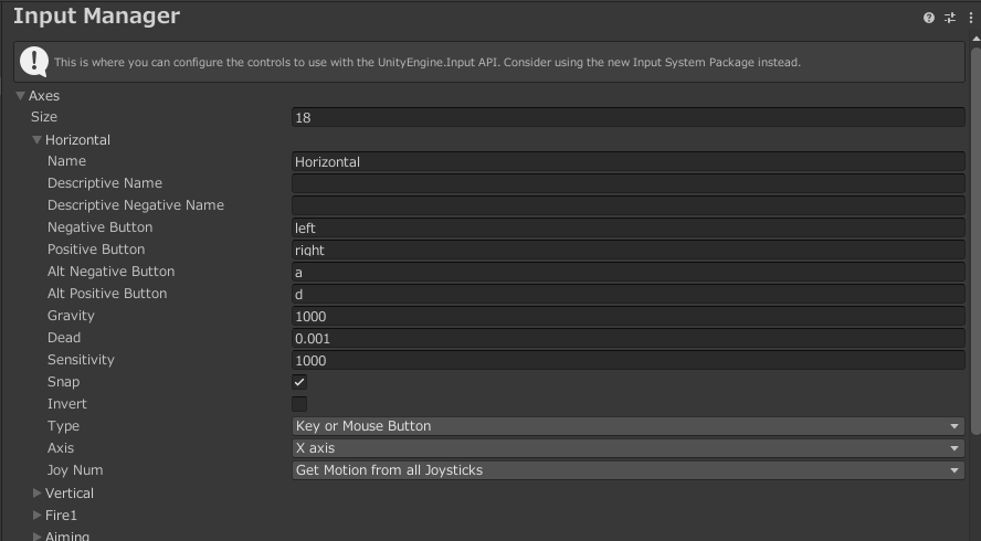 - 가상 축 : 버튼, 키 등과 같은 컨트롤에 매핑되는 이 축은 사용자가 컨트롤을 활성화하면 [–1..1] 범위의 값을 수신한다. (스크립트에서 사용할 수 있다)