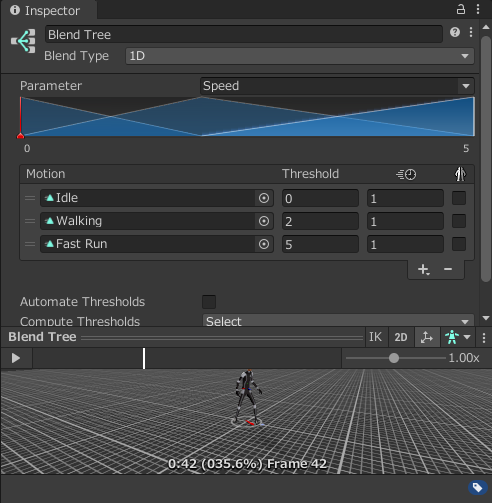 - 애니메이션 컨트롤러 우클릭 → Create State → new Blend Tree 클릭 → 이름변경(UnAramed) 후 더블클릭 → Blend Tree에 우클릭 후 Add motion 클릭 → Automate Thresholds 체크해제 → 여러개 넣을 애니메이션을 Motion에 넣고 Thresh에 상태가 변할때의 값을 넣습니다.