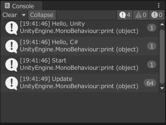 - Start함수에 print("Start"); 작성, Update 함수에 print("Update");를 작성한다.